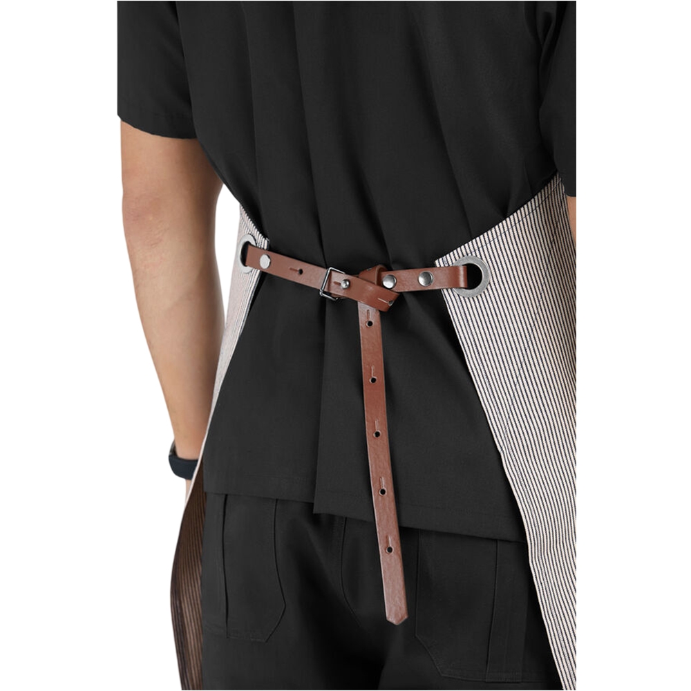 • Faux leather details on pocket for chef’s side towel