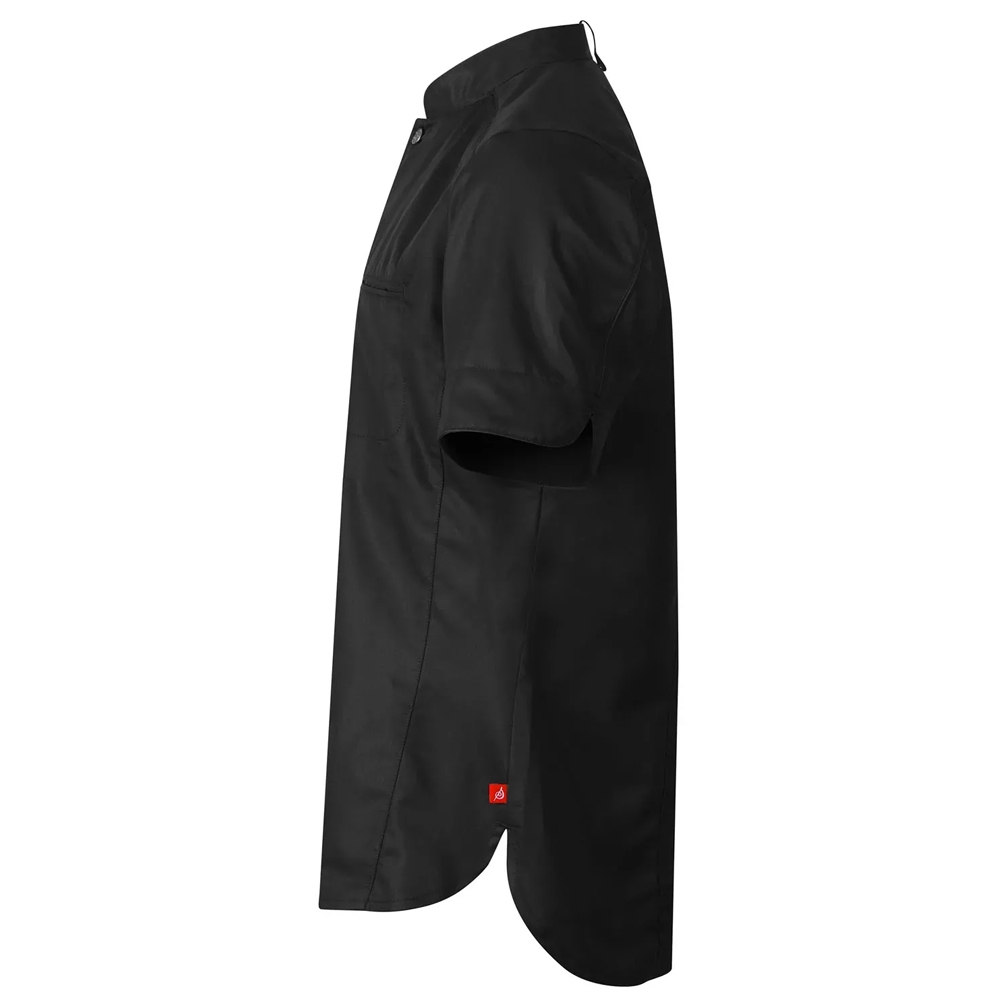 Modern men’s chef shirt with short sleeves and a slightly slimmer fit. This design is inspired by a shirt, so it has a rounded hem and is longer at the back.