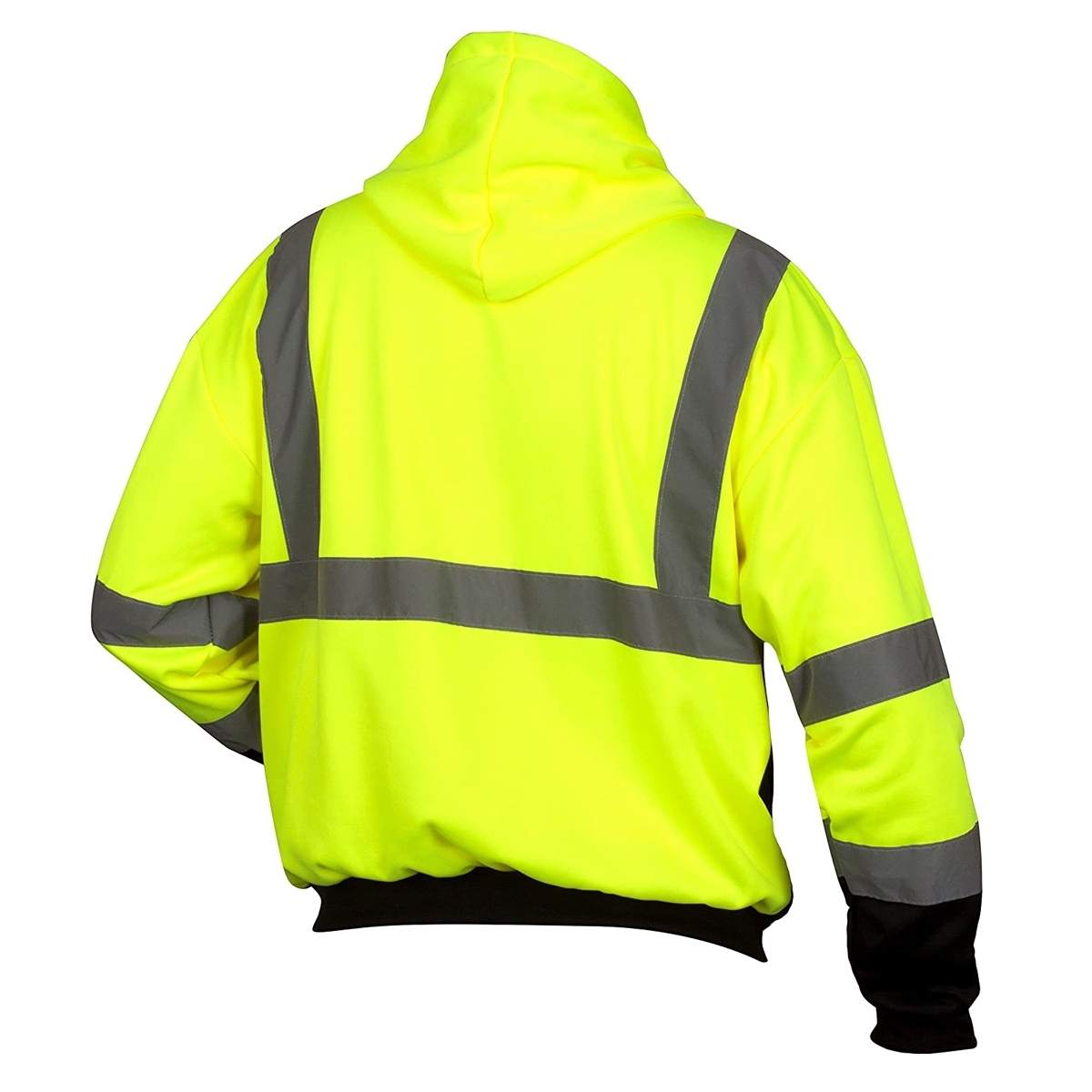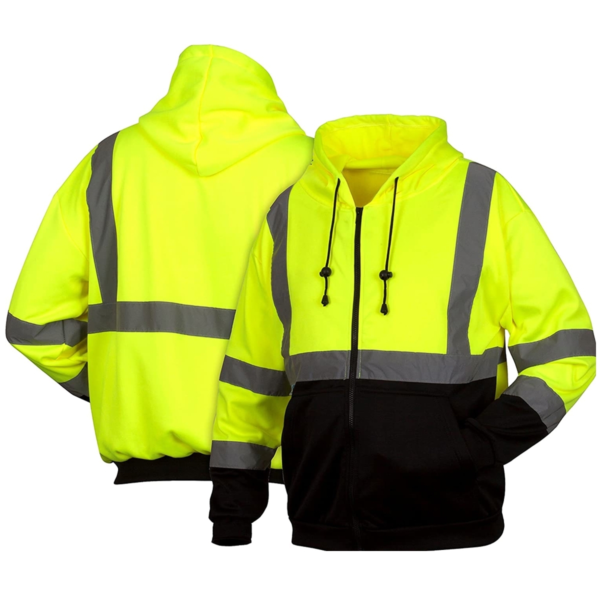 It has two lower pockets and an adjustable drawstring work wear hood.